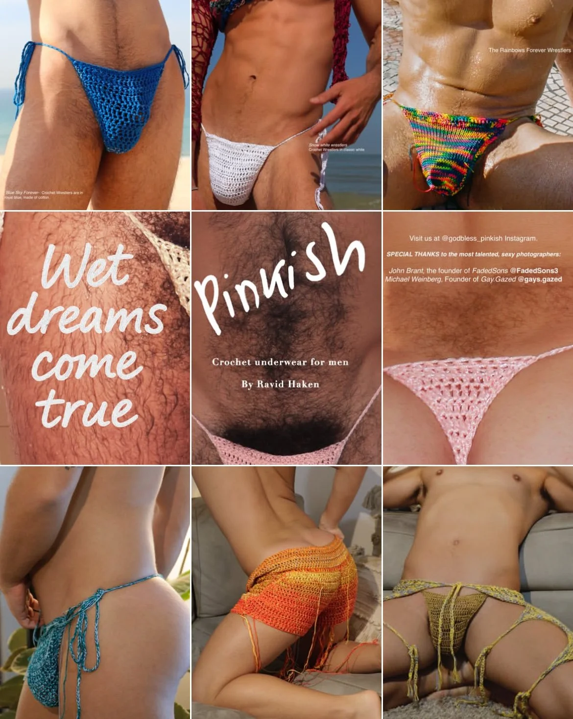 Designed by Ravid Haken, a textile and fashion designer. PINKISH brings a new language to the body — one made of threads, tenderness, and rebellion. Every crochet thong, every strap, every loop is a small defiance: against speed, against shame, against what’s expected.